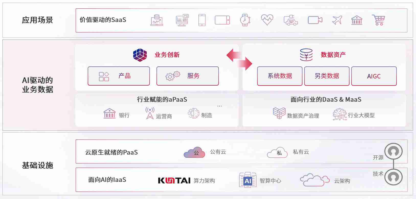 数字时代,,,,围绕企业数字化转型的关键要素,,,酷游官网数码开创性的提出数云融合战略和技术体系框架,,着力在云原生、、、、数字原生、、、AI原生和信创产业上架构产品和服务能力,,,,为处在不同数字化转型阶段的快消零售、、、、汽车、、金融、、、医疗、、、、政企、、、教育、、、运营商等行业客户提供泛在的敏捷IT能力和融合的数据驱动能力,,,,构建跨界融合创新的数字业务场景和新业务模式,,助力企业级客户建立面向未来的核心能力和竞争优势,,全面推动社会的数字化、、、智能化转型升级。。。